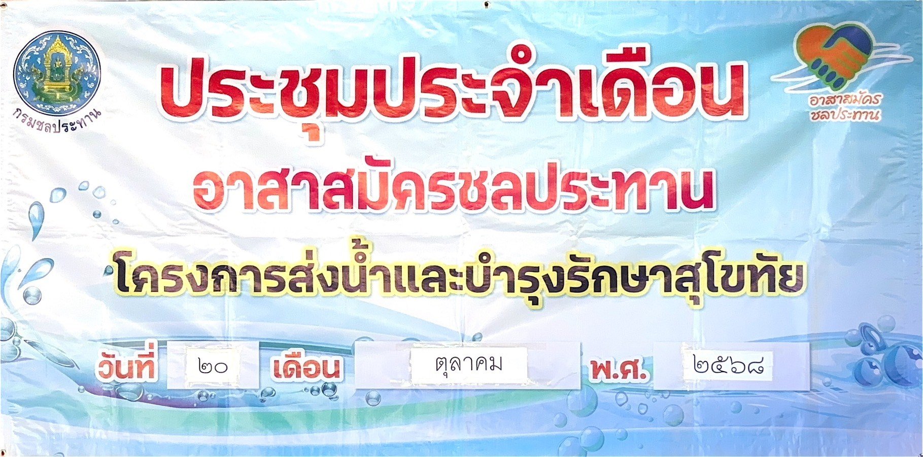 วันจันทร์ที่ 20 ตุลาคม พ.ศ. 2568 เวลา 09.30 น. นายสัมพันธ์ พิรกุลวานิช ผู้อำนวยการโครงการส่งน้ำและบำรุงรักษาสุโขทัย มอบหมายให้นายพนม ภวันตุ พนักงานธุรการ ส 3 พร้อมเจ้าหน้าที่ผู้เกี่ยวข้อง ประชุมอาสาสมัครชลประทานในเขตพื้นที่ฝ่ายส่งน้ำและบำรุงรักษาที่ 1 ประจำเดือนตุลาคม 2568 เพื่อชี้แจงการปฏิบัติงานและรับฟังปัญหาอุปสรรคในการปฏิบัติงาน ให้ช่วยติดตามเกี่ยวกับค่ากระแสไฟฟ้าฤดูฝน 2568 โดยมีอาสาสมัครชลประทานและเจ้าหน้าที่ที่เกี่ยวข้องร่วมประชุม ณ ศาลาอเนกประสงค์ฝ่ายส่งน้ำและบำรุงรักษาที่ 1 โครงการส่งน้ำและบำรุงรักษาสุโขทัย
