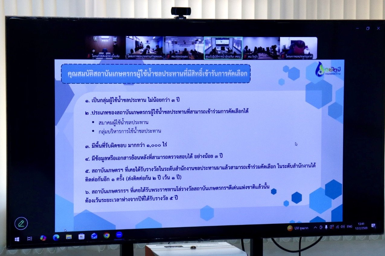 วันพฤหัสบดีที่ 12 กุมภาพันธ์ พ.ศ. 2569 เวลา 13.30 น. นายสัมพันธ์ พิรกุลวานิช ผู้อำนวยการโครงการส่งน้ำและบำรุงรักษาสุโขทัย มอบหมายให้ นายพิษณุ พิริยะวิศรุต หัวหน้าฝ่ายจัดสรรน้ำและปรับปรุงระบบชลประทาน พร้อมเจ้าหน้าที่ผู้เกี่ยวข้อง เข้าร่วมประชุมชี้แจงแนวทางและหลักเกณฑ์การคัดเลือกสถาบันเกษตรกรผู้ใช้น้ำชลประทานดีเด่น ประจำปี พ.ศ. 2570 (ระดับสำนักงานชลประทาน) เพื่อทราบถึงหลักเกณฑ์การคัดเลือกสถาบันเกษตรกรผู้ใช้น้ำชลประทานดีเด่น คุณสมบัติสถาบันเกษตรกรผู้ใช้น้ำชลประทานที่มีสิทธิ์เข้ารับการคัดเลือก และรูปแบบเอกสารและหลักเกณฑ์ในการนำเสนอเพื่อประกอบการพิจารณาคัดเลือก ในรูปแบบการประชุมทางไกล ผ่านสื่ออิเล็กทรอนิกส์ (Application Zoom) ณ ห้องประชุม SWOC 04 ส่วนบริหารจัดการน้ำและบำรุงรักษา สำนักงานชลประทานที่ 4 มายัง ณ ห้องประชุมโครงการส่งน้ำและบำรุงรักษาสุโขทัย