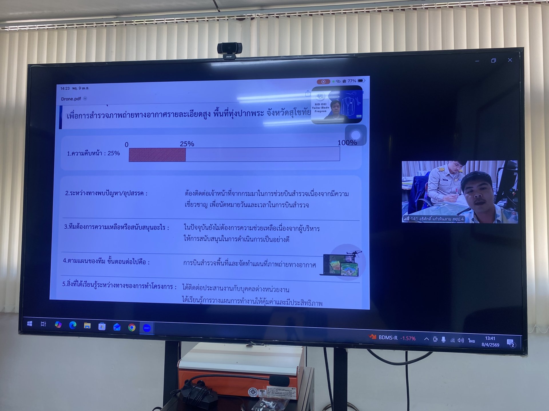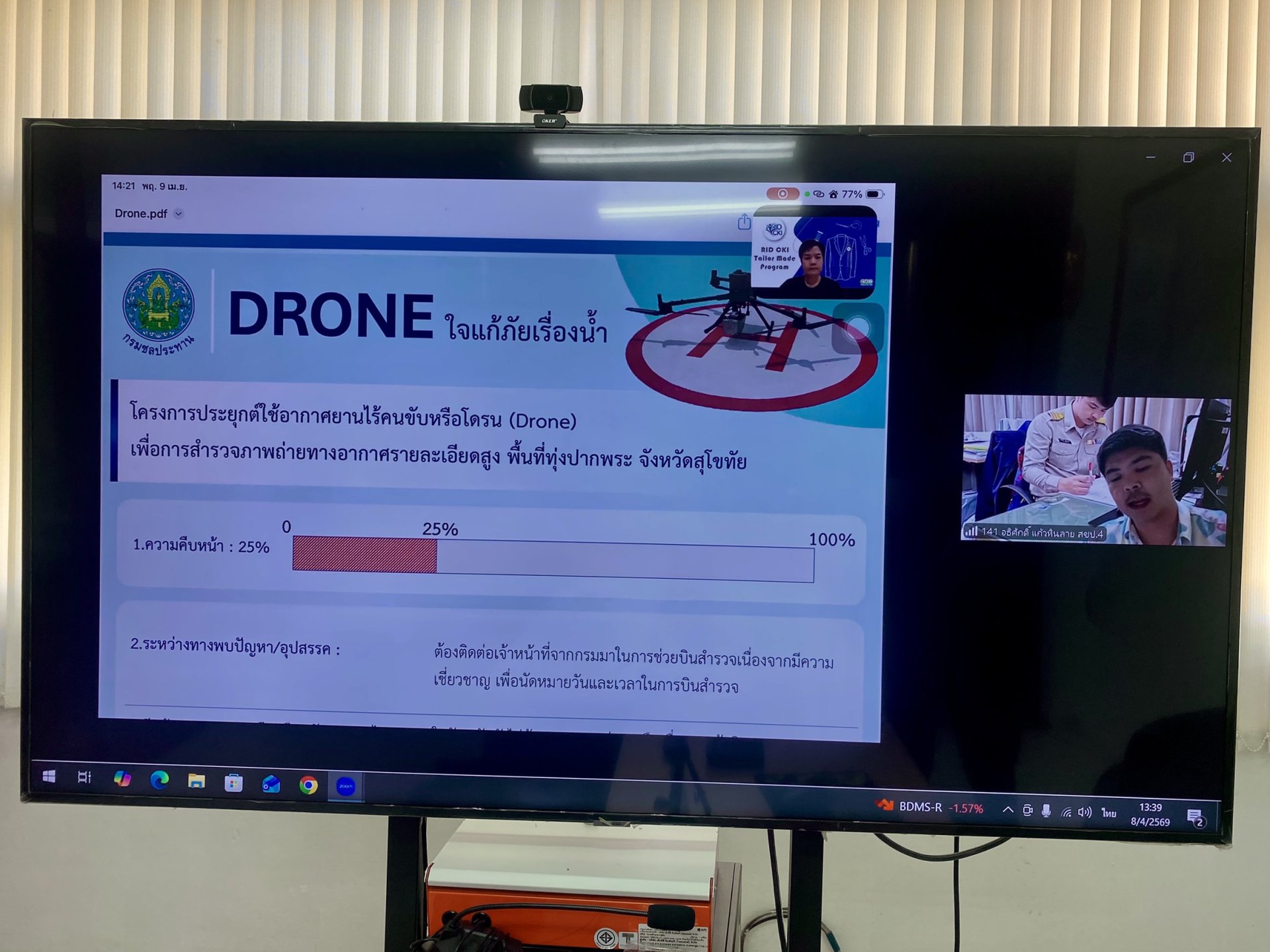 วันพฤหัสบดีที่ 9 เมษายน พ.ศ. 2569 เวลา 13.00 น. นายสัมพันธ์ พิรกุลวานิช ผู้อำนวยการโครงการส่งน้ำและบำรุงรักษาสุโขทัย มอบหมายให้ นางสาวสุภาพร ปัญญา หัวหน้าฝ่ายบริหารทั่วไป และนายศิลป์ศรุต พุทธเจริญทอง หัวหน้าฝ่ายส่งน้ำและบำรุงรักษาที่ 1 เข้าร่วมประชุมโครงการสัมมนาเชิงปฏิบัติการ CKI Level Up ครั้งที่ 1 เพื่อติดตามความคืบหน้าการดำเนินโครงการ RID CKI Tailor - made ในกิจกรรม Team Project Sharing โดยมุ่งเน้นการขยายผลและส่งเสริมค่านิยม วัฒนธรรมองค์กร ตลอดจนการจัดการความรู้ที่เชื่อมโยงกับการสร้างนวัตกรรมในการทำงาน เพื่อเสริมสร้างแนวทางปฏิบัติให้บุคลากรสามารถดำเนินงานได้อย่างมีประสิทธิภาพ ในรูปแบบการประชุมทางไกล ผ่านสื่ออิเล็กทรอนิกส์ (Application Zoom) ณ ห้องประชุมโครงการส่งน้ำและบำรุงรักษาสุโขทัย